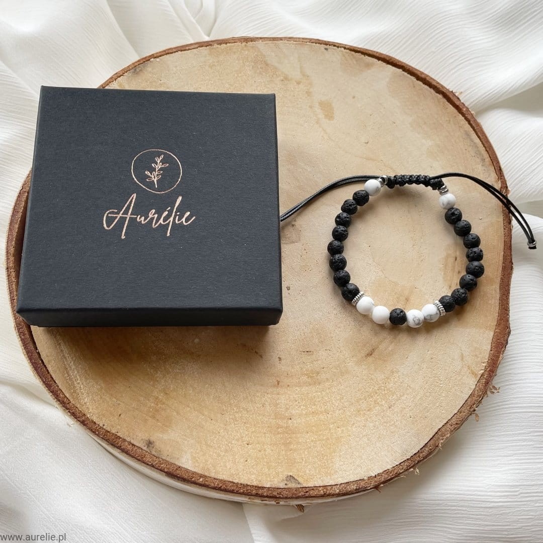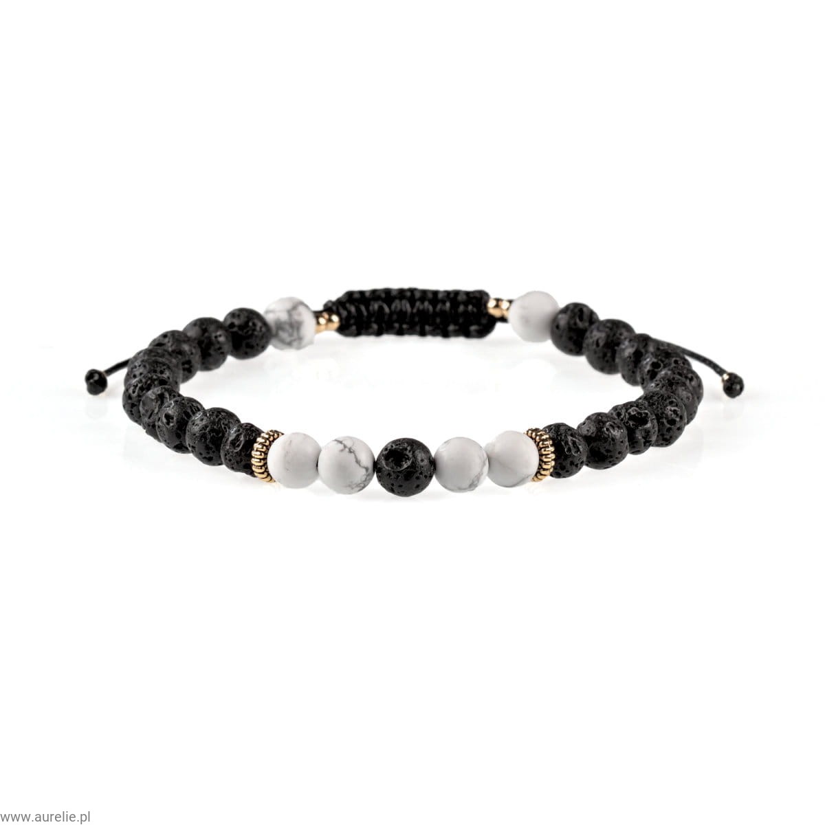 - Bransoletka męska wykonana została z czarnego sznurka i nawleczonych kamieni naturalnych: lawy wulkanicznej i howlitu oraz ozdób ze stali szlachetnej w kolorze srebrnym lub złotym.