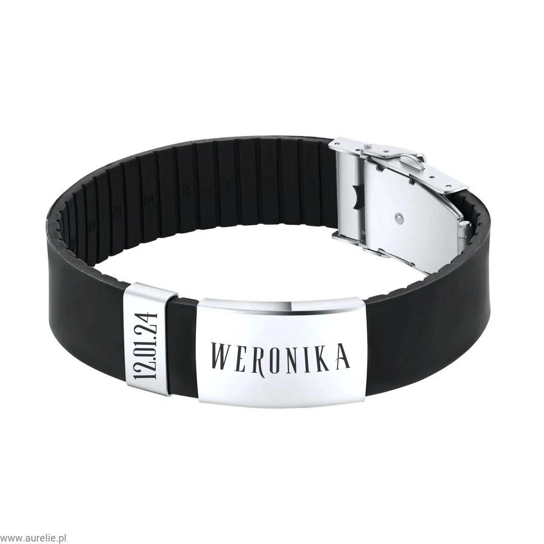Kauczukowa bransoletka może zostać spersonalizowana poprzez dodanie grawerunku na 2 blaszkach.