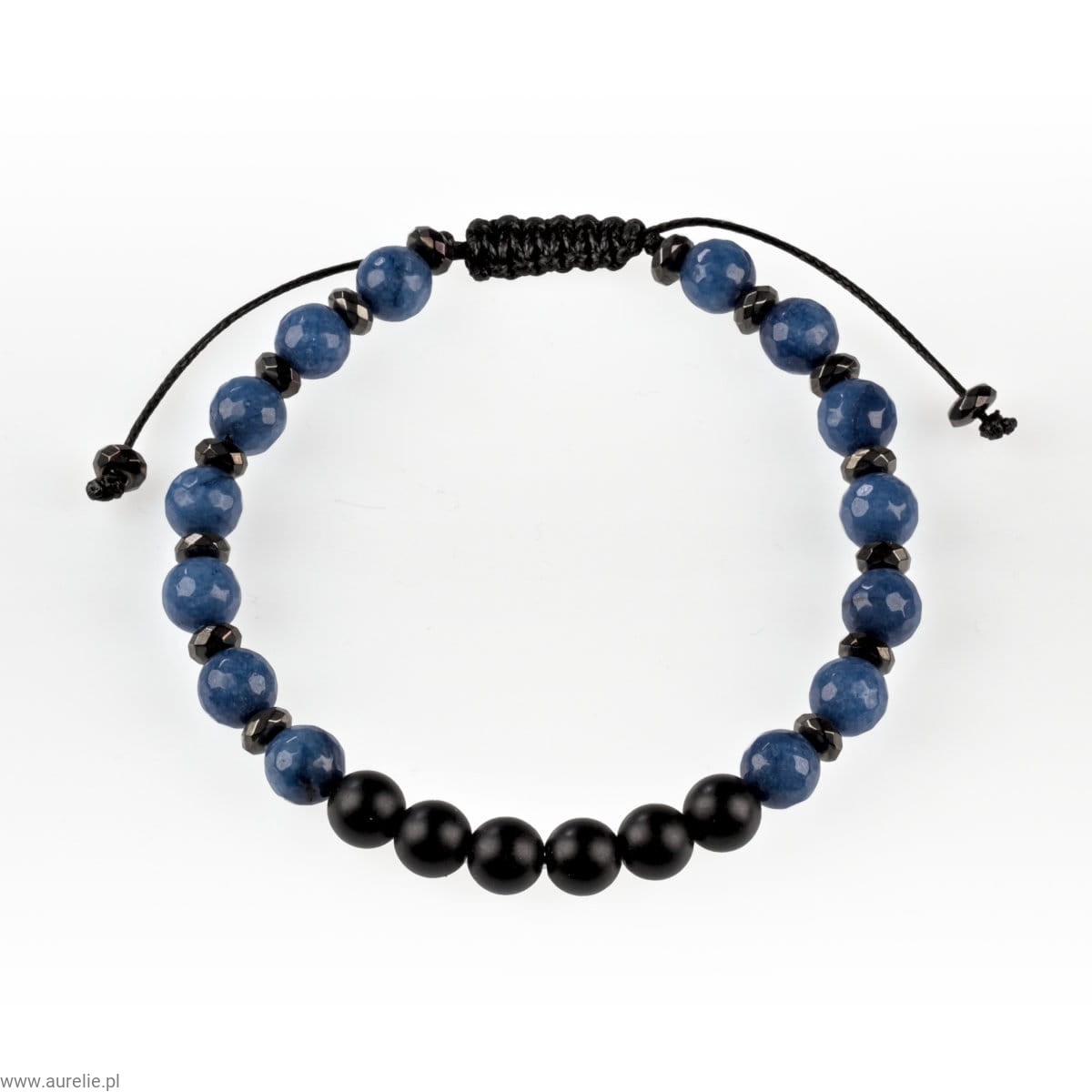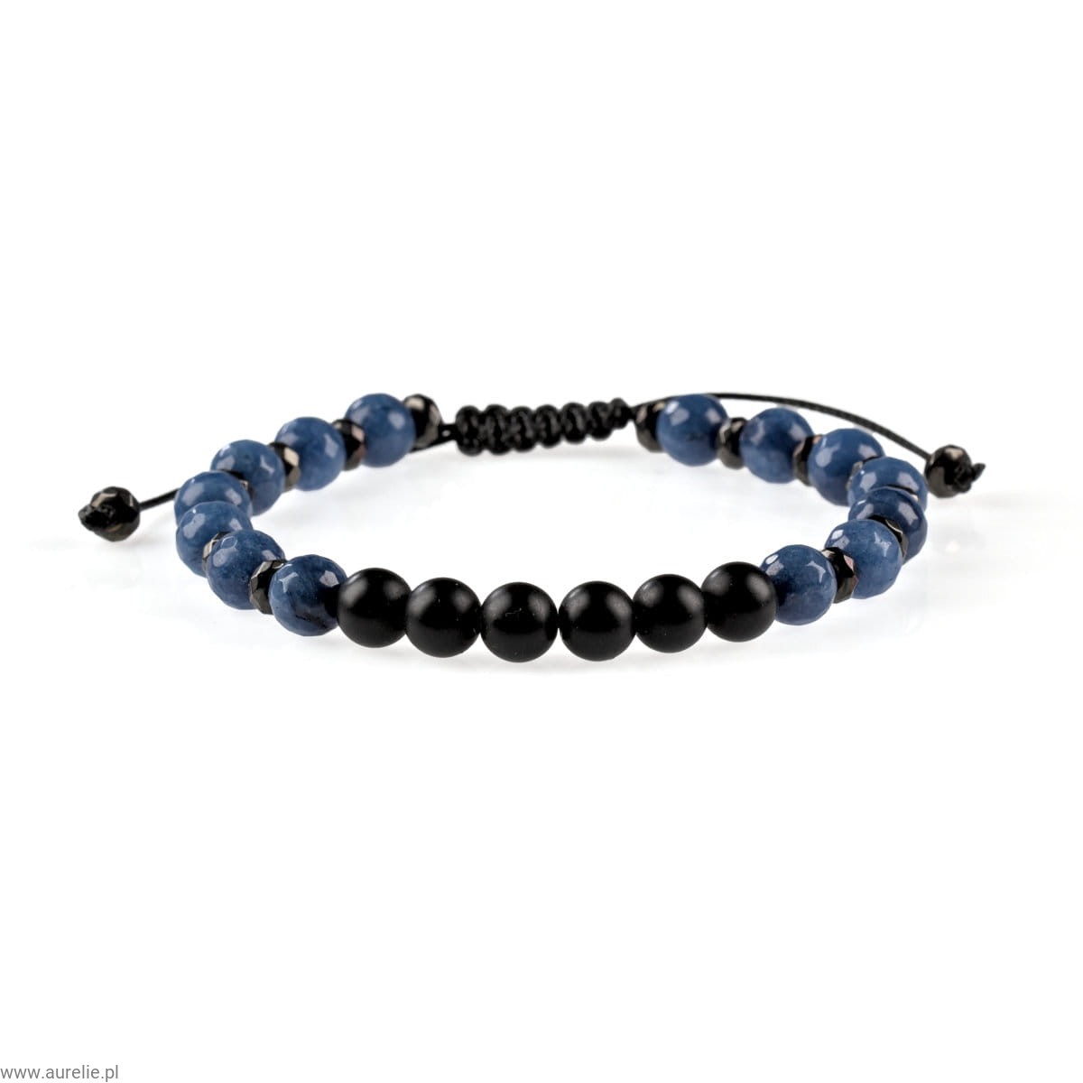- Bransoletka męska wykonana została z czarnego sznurka jubilerskiego i nawleczonych kamieni naturalnych: lapis lazuli, onyksu i hematytów