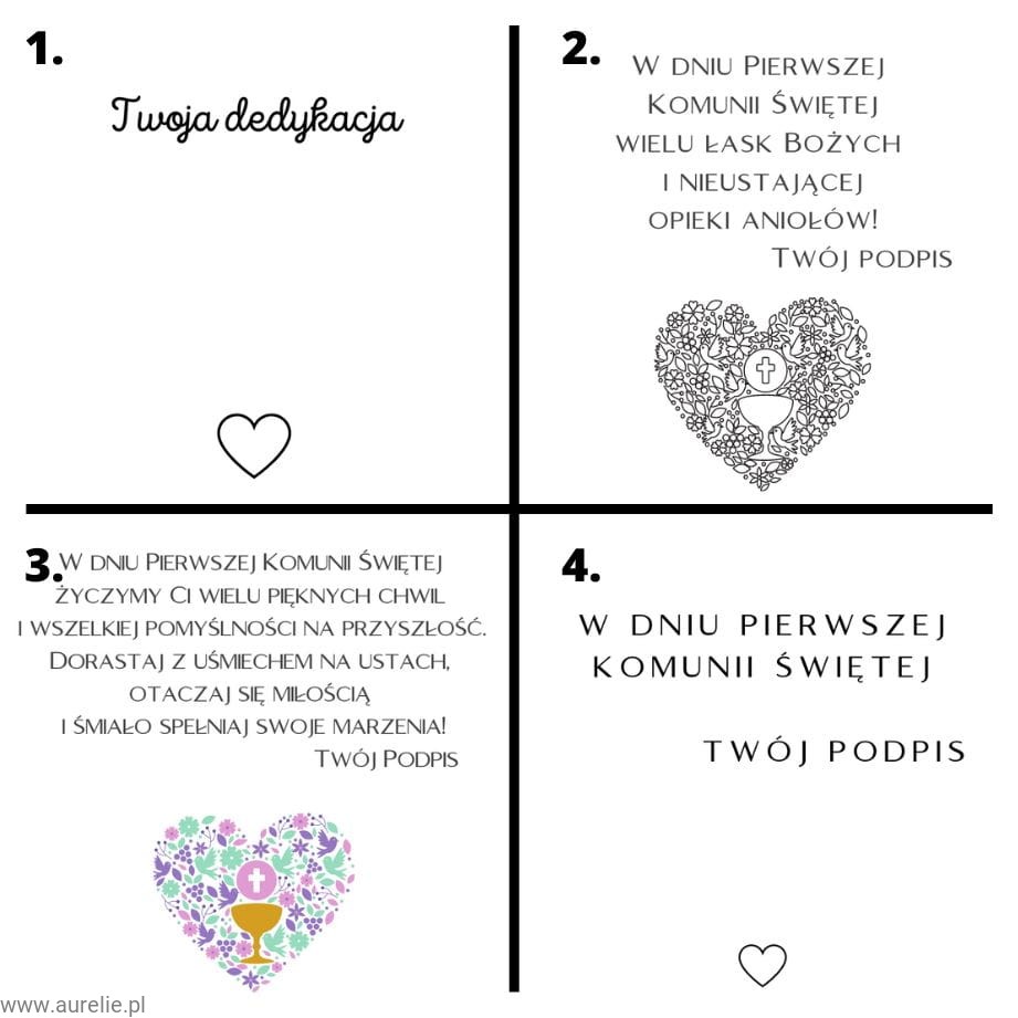 - Personalizowana dedykacja w pudełku prezentowym lub gotowe karteczki z dedykacją na komunię świętą