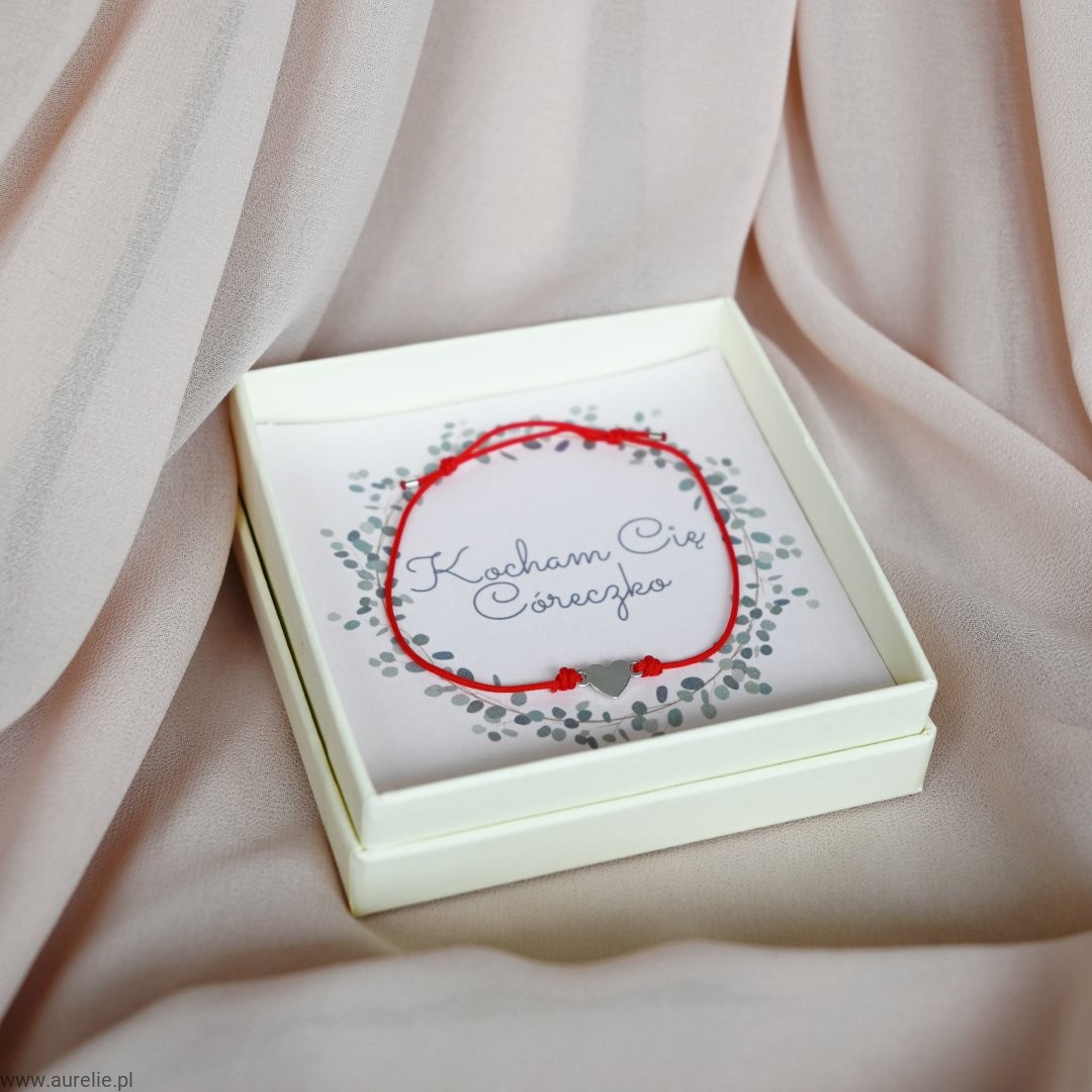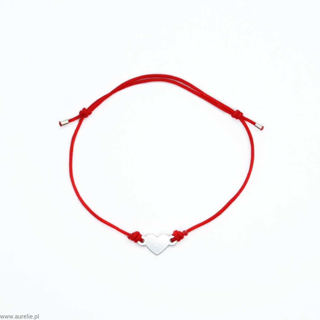 - Bransoletka została wykonana z czerwonego sznurka jubilerskiej i zawieszki z rodowanego srebra w kształcie serca.