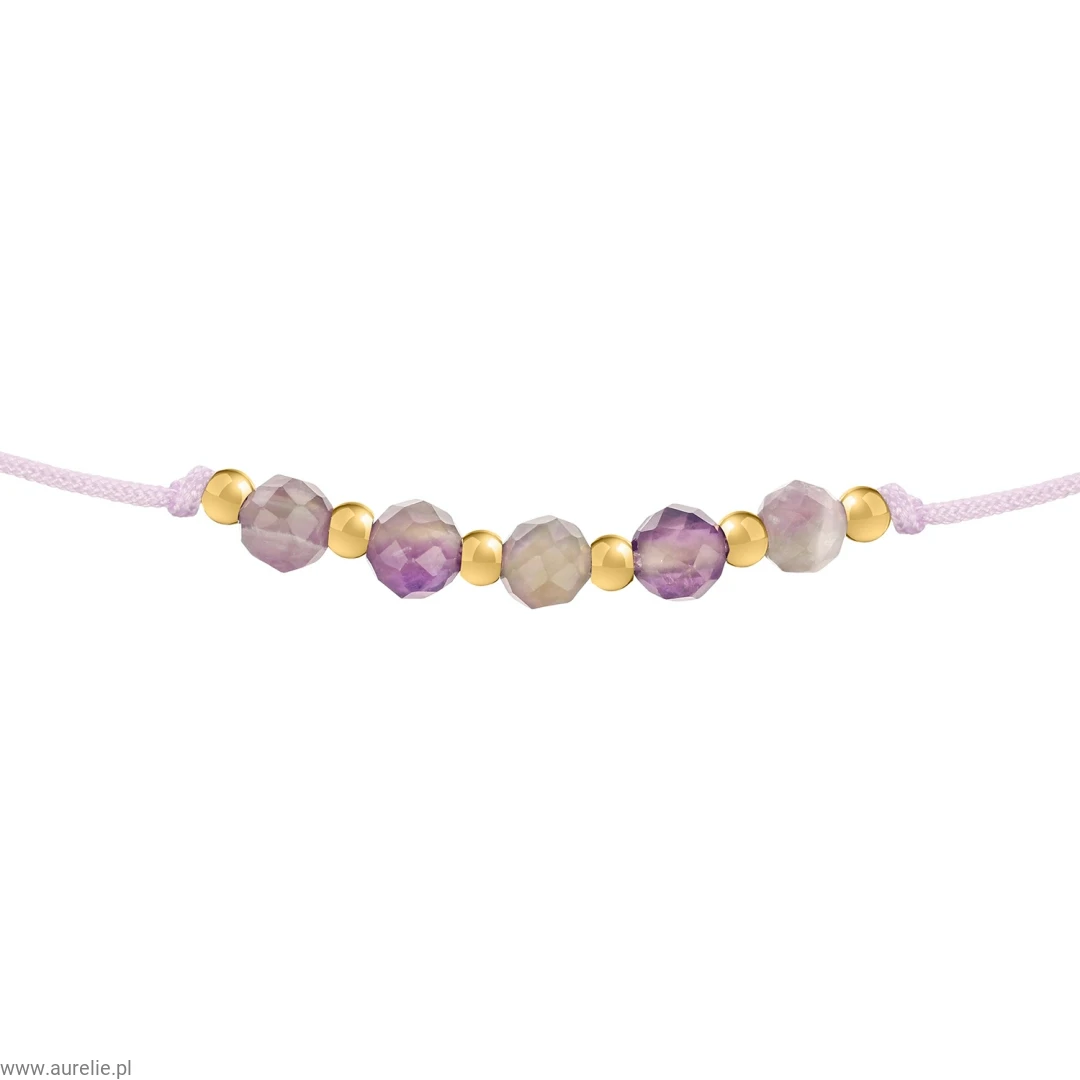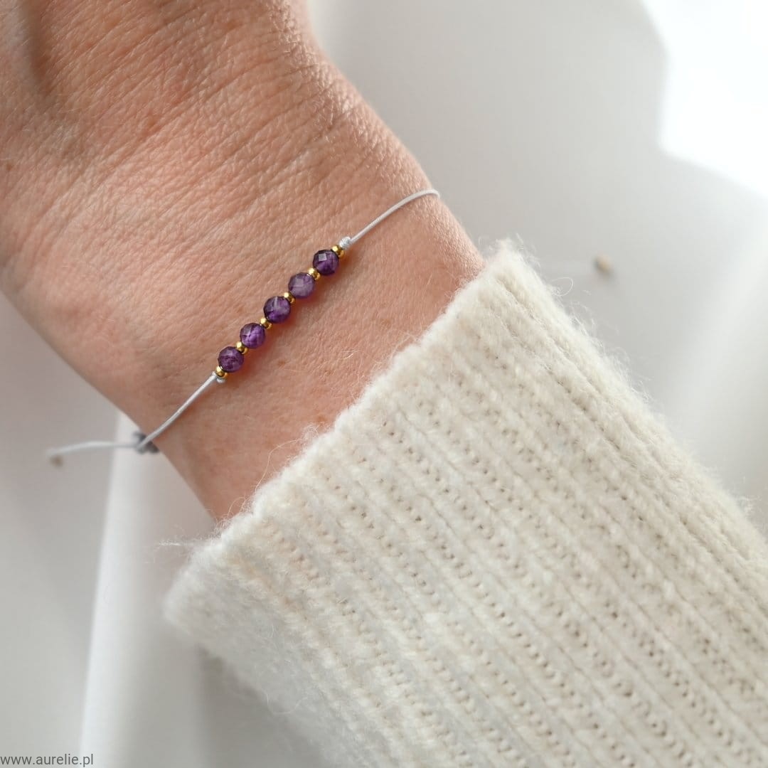 Bransoletka z ametystu ma regulację rozmiaru - wystarczy przesunąć węzełki, żeby dopasować ją do nadgarstka.