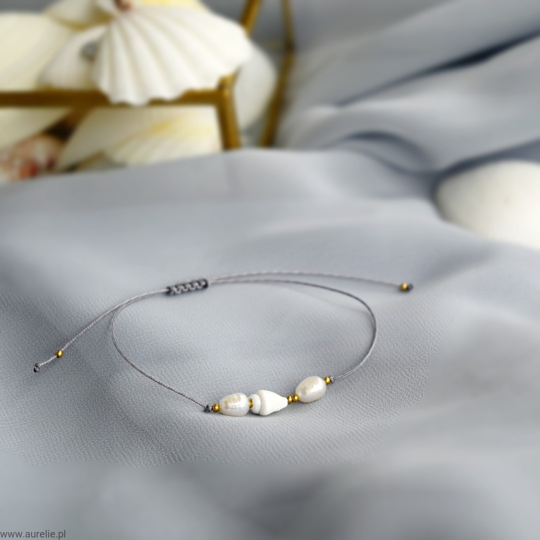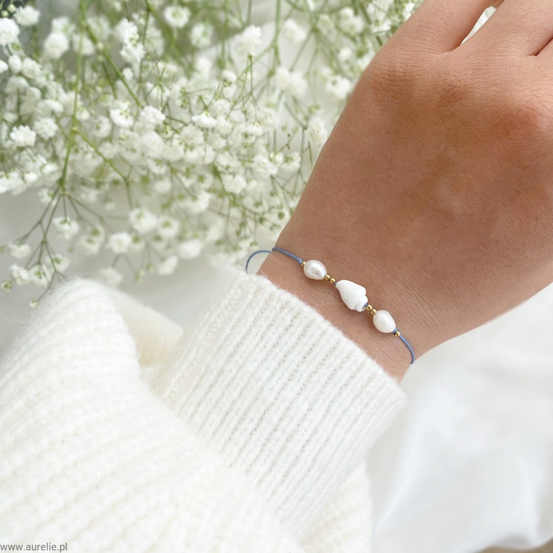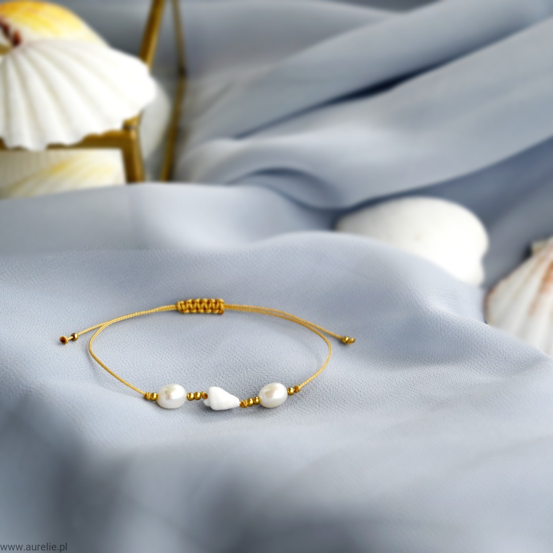 - Bransoletkę wykonujemy z naturalnych pereł słodkowodnych, naturalnej muszelki oraz kuleczek ze stali szlachetnej w kolorze złotym nawleczonych na nylonową nić.
