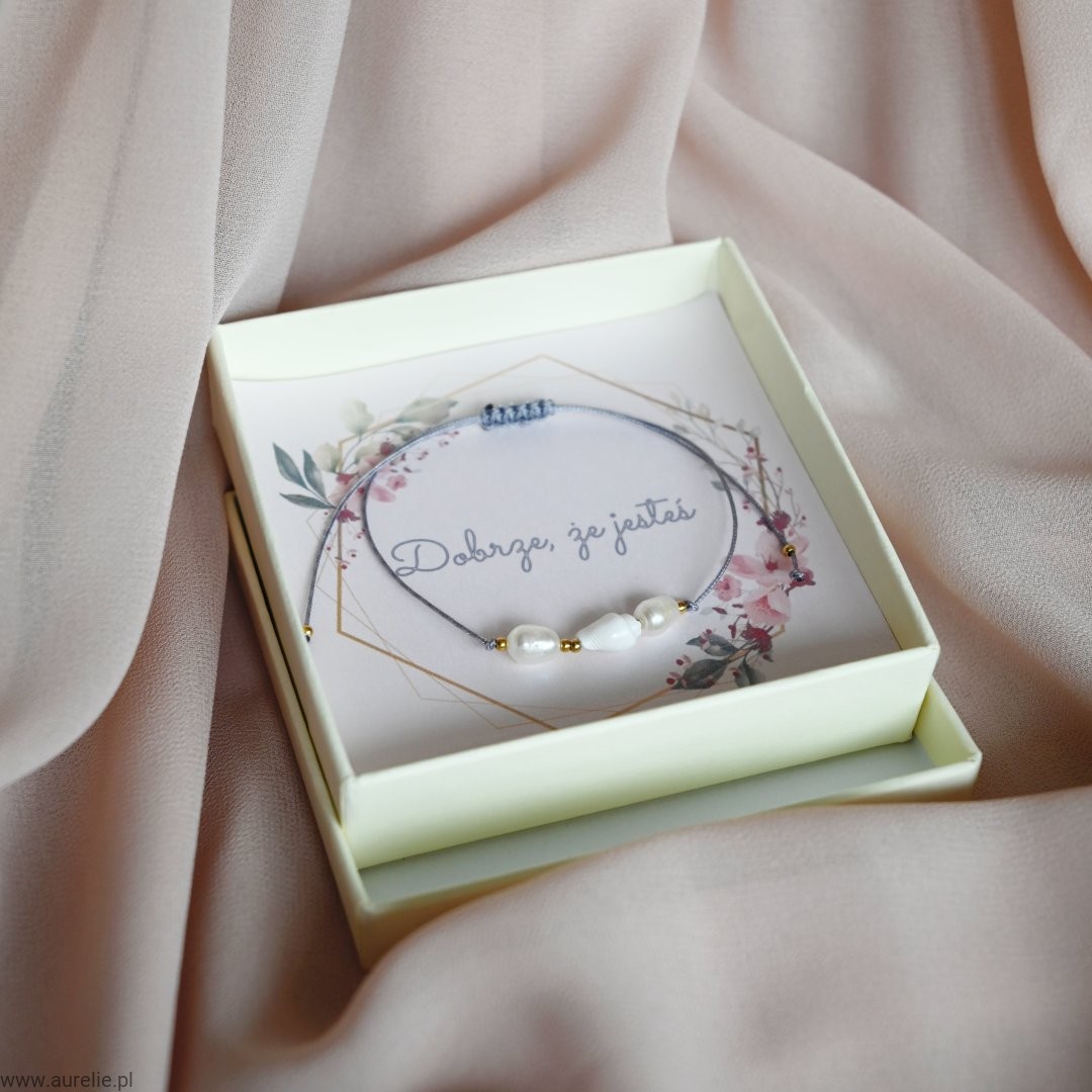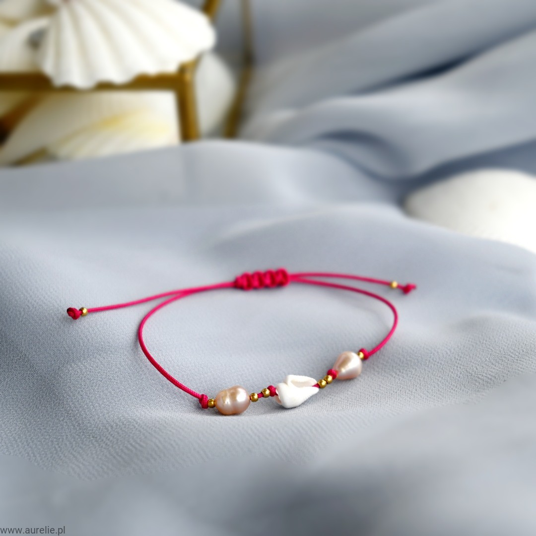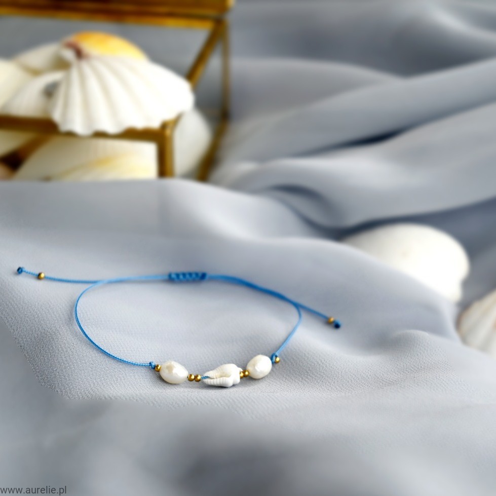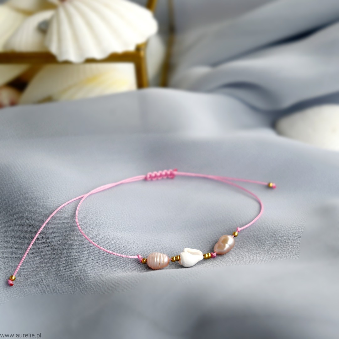 - Bransoletkę wykonujemy z naturalnych pereł słodkowodnych, naturalnej muszelki oraz kuleczek ze stali szlachetnej w kolorze złotym nawleczonych na nylonową nić.