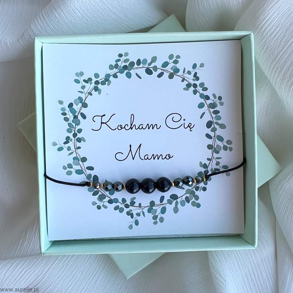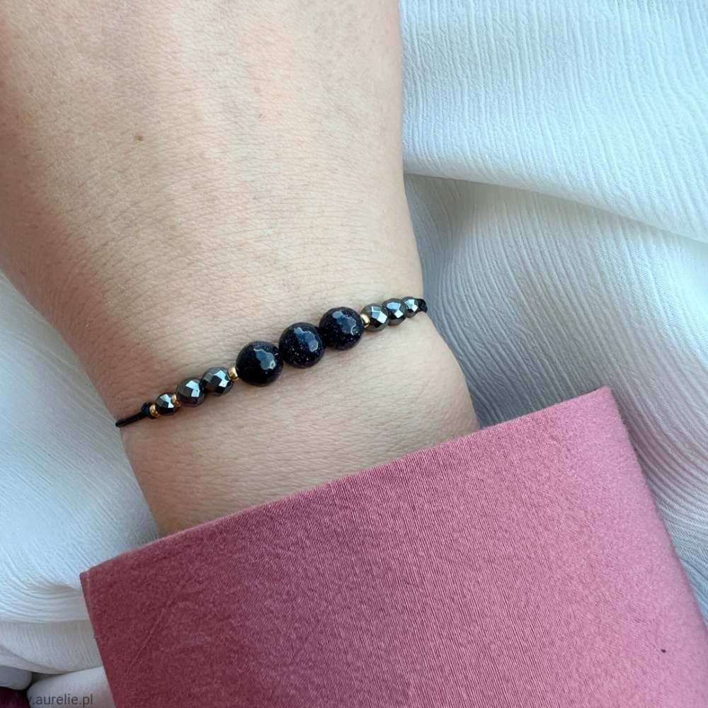 Bransoletkę wykonujemy z czarnego sznurka jubilerskiego, na który nawlekamy hematyty i kamienie nocy kairu oraz koraliki ze stali chirurgicznej w kolorze złotym.