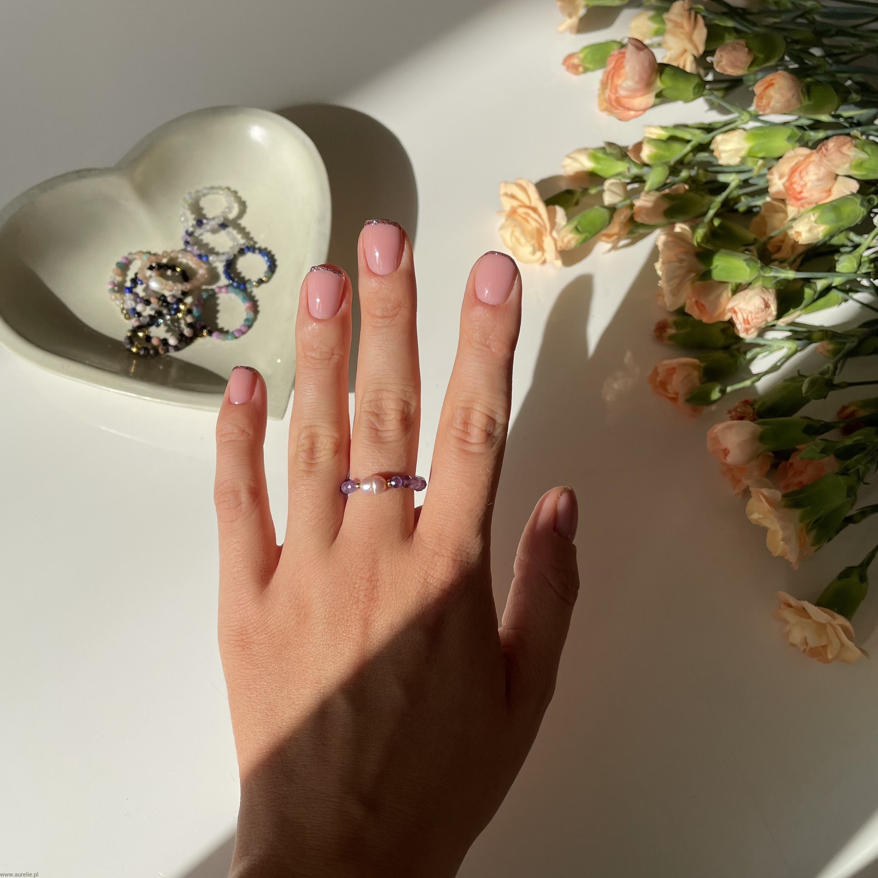 - Pierścionek wykonujemy z elastycznej żyłki jubilerskiej, słodkowodnej perły oraz ametystów i koralików ze stali szlachetnej.